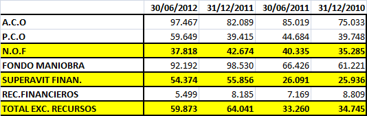 La compañía presenta un Superavit de financiación, que se ha ido incrementado en los últimos tiempos como consecuencia de un importante aumento del fondo de maniobra, lo que significa desde un punto de vista de liquidez, una mejor posición, duplicando el superavit financiero a 30.06.2012 respecto a la posición del 30.06.2011 lo que le permite invertir ese excedente en inversiones financieras temporales.