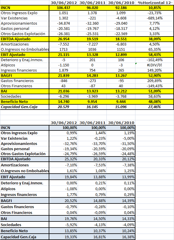 Como comentario final, es importante destacar el incremento de un 48% en el beneficio neto respecto a 2011. Y esta circunstancia demuestra el importante apalancamiento operativo de este tipo de empresas, con un peso relevante de sus costes fijos, donde incrementos en la cifra de ventas supondrá un incremento proporcionalmente mayor.