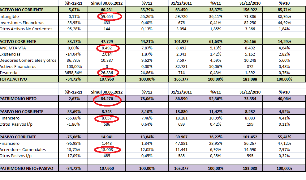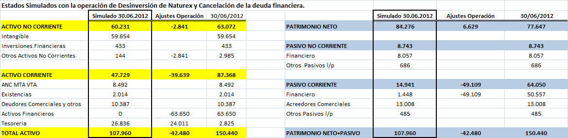 ANALISIS CUANTITATIVO.- Es una compañía cuyo balance presentado a fecha 30.06.2.012 nada tendrá que ver con la fotografia de cierre de ejercicio una vez ha ejecutado la venta de la participación residual en Naturex y haya adelantado la cancelación de la deuda que mantiene con las entidades financieras. Por lo tanto, se hace fundamental hacer la simulación de esta operación que se ha efectuado en el último trimestre con fecha del segundo trimestre y partir del balance ajustado realizar el análisis de esta compañía, de lo contrario podríamos hacer una interpretación errónea del análisis de los estados financieros a Junio de 2.012: