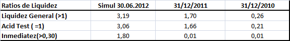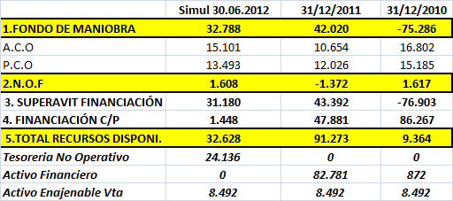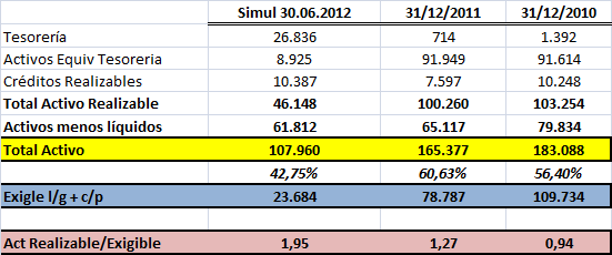 La compañía presenta una más que interesante posición de liquidez. Durante el ejercicio actual y una vez ajustada la operación que ha efectuado en el último trimestre, se aprecia claramente que dispone de un superavit de financiación mucho más sano que antes pese a ser inferior, si nos fijamos en los datos de 31.12.2011, el total de recursus disponibles que existía estaba formado en una parte muy importante por deuda financiera con devengo de gasto financiero, mientras que ahora ocurre todo lo contrario, se ha eliminado la deuda bancaria mediante la realización del activo financiero a valor razonable y presenta una situación de enorme deshaogo y fuerte solvencia a corto plazo que asegura la viabilidad de la compañía.