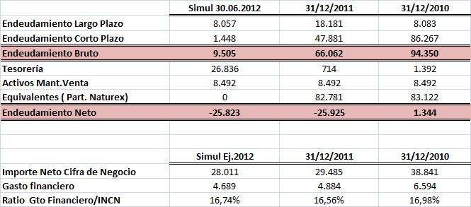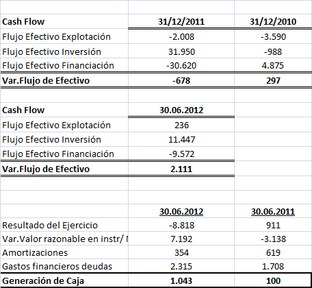 Cash Flow.- Me ha parecido interesante separar los cuadros según se puede apreciar en la estructura inferior. Vemos que al cierre del ejercicio de 2011 y 2012 la actividad ordinaria de la compañía no era capaz de generar un flujo de caja positivo, fundamental para la buena salud de cualquier compañía, además de esto, se aprecia claramente que durante 2.011 vendió de manera relevante participación en el capital de Naturex, esta desinversión, se destinó a la amortización de deuda. Sí nos fijamos en los cuadros inferiores, se aprecia claramente que a fecha cierre del primer semestre de 2.012, por fin, consigue generar un flujo de efectivo de explotación positivo, entre otras, como consecuencia del programa de optimización de costes que está llevando a cabo la compañía. En los 2 últimos cuadros, principalmente el de 30.06.2.012 se aprecia que a cierre del primer semestre la Sociedad ha sido capaz de generar una caja económica de más de 1 millón de euros con las siguientes matizaciones: He ajustado los gastos no desembolsables y los gastos financieros de deuda, haciendo el ejercicio de que esta partida a partir de 2.013 será inmaterial por la cancelación de deuda. Sí hacemos este ejercicio, podemos ser más optimistas con la compañía.