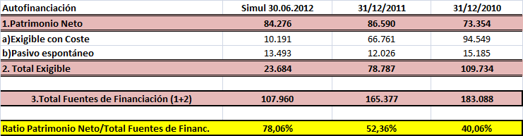 Autofinanciación.- Se aprecia una enorme mejora en la ratio de autofinanciación, con la operación societaria genera plusvalía que incrementa los fondos propios, elimina deuda de balance y mejora la posición de caja. Se aprecia que a fecha 30.06.2012 8 de cada 10 euros de financiación que obtiene la compañía es a través de los recursos propios, desde luego la pinta del balance de situación ha mejorado mucho.