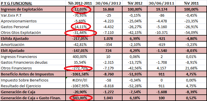Hay muchas cosas que decir en este comparativo. Empezaremos por la parte negativa, sin lugar a dudas la caida de los ingresos de explotación , con una bajada respecto a 2011 de un 12%. No es un dato postivo, pero sí excluímos el sector de control de peso, ha existido crecimiento en otros sectores de negocio, y parece por el informe de resultados de la compañía, la caida en ventas se debió principalmente a un producto específico.Sí no se hubiera dado esta circunstancia la evolución en los 6 primeros meses hubiera sido muchísimo más Positiva.