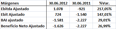 Márgenes.- Vemos claramente en el cuadro inferior la enorme mejoría que experimenta la compañía en el comparativo. El ebitda ajustado aumenta de manera importante, a pesar de disminuir los ingresos de explotación y como consecuencia de las acciones de racionalización de gastos operativos que están sutiendo efecto. Ahora nos centramos en los 2 últimos márgenes, sí ajustamos la variación a valor razonable y el ajuste por puesta en equivalencia de la participación en naturex, observamos claramente la mejoría en el resultado del ejercicio. Sí además tenemos en cuenta la eliminación de gasto financiero para 2.013 lo hubieramos aplicado en este primer semestre mediante un ajuste, nos encontraríamos con un resultado levemente positivo, que nos hace presagiar que la compañía podría tener una buena evolución en los próximos trimestres.