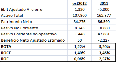 Rentabilidades.-He excluído el Eva porque el coste medio del pasivo no me parecia representativo, y he centrado el análisis en estos 3 ratios. La parte positiva sin duda alguna, es que las 3 ratios inferiores presentan en el estimado de 2.012 un valor positivo. Pese a esto, siguen siendo ratios enormemente bajos. El peso de un fondo de comercio tan importante pesa mucho sobre la solvencia del balance, al ser un activo que no está refenciado a un valor de mercado, y no ser un bien material facilmente realizable. Sin duda alguna, la tenencia de deuda en ningún caso puede ser sostenible con estás rentabilidades, porque el coste efectivo de financiarte es superior a la rentabilidad que obtienes de invertir estos fondos. Por tanto, la cancelación completa de la deuda era imprescindible bajo mi punto de vista.