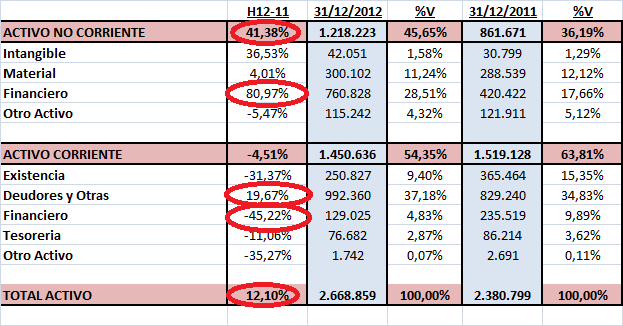 Respecto a que es una empresa de marcado caracter industrial, parece claro por el peso de su activo no corriente, ya que representa cerca de un 46% sobre el total de su activo. Vemos que el activo se ha incrementado en más de un 12% respecto al ejercicio anterior lo cual no es positivo porque su cifra de ventas no ha conseguido incrementarla, esto supondrá una penalización en los ratios de rentabilidad sobre activos, puesto que ha necesitado realizar una mayor inversión respecto al ejercicio anterior para obtener prácticamente la misma cifra de ventas. Esto, como se ha indicado anteriormente tiene su explicación en el peso de las concesiones (saldos registrados en el activo financiero a l/p por el grado de avance de los trabajos ). Por lo demás, se atisba un empeoramiento en los ratios de liquidez ( incremento importante en su activo no corriente +81% proporcionalmente mayor al incremento de su pasivo no corriente + fondos propios, produciendo un empeoramiento del fondo de maniobra , que junto a la disminución de su tesoreria + equivalentes respecto al ejercicio anterior hará que la compañía presente un deterioro de los ratios de liquidez que debería tener un marcado carácter temporal cuando comience a recibir el retorno de los flujos de caja de los trenes entregados durante 2.012 referente a los contatos de concesiones.