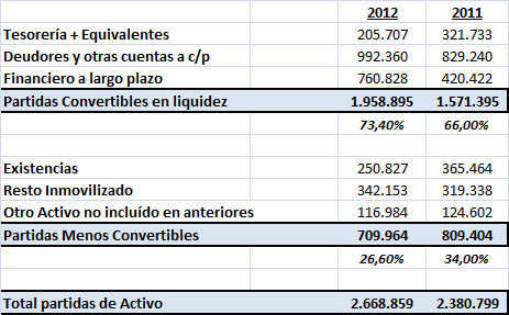ACTIVO COMPAÑÍA. El activo de esta compañía es de una buena calidad desde el punto de vista de conversión en liquidez. Llama la atención el enorme peso del activo financiero a largo plazo dentro de su activo, representando esta partida un porcentaje cercano al 30% sobre el activo total( la mayor parte son saldos de clientes a l/p por el avance en los trabajos de las concesiones). Según el cuadro inferior sí separamos las partidas por la facilidad de conversión en liquidez, considerando no el plazo temporal de transformación en liquidez, sino la facilidad de realización de esta conversión en base a la naturaleza de la partida, señalando como partidas menos liquidas las existencias ( primero hay que venderlas y luego cobrarlas), el inmovilizado material e intangible, por la cuantía y la mayor dificultad de colocación al implicar necesidades fuertes de financiación por parte del comprador, el activo por impuesto diferido porque no es 100% seguro que pueda compensar dichos créditos puesto que depende de la generación futura de beneficios en determinadas circunstancias, nos quedamos con un dato muy positivo, y es que en 2.012 casi 7,5 euros por cada 10 euros de su activo es de buena calidad desde el punto de vista de liquidez, por 6,6 euros en 2.011, lo que a priori nos permite afirmar que estamos ante una empresa con un activo de buena calidad desde el punto de vista de realización en efectivo.. Esto nos deberá llevar a prestar especial atención a las partidas de cuentas a cobrar (clientes) tanto a l/p como a c/p y su nivel crediticio, y en este aspecto, según se desprende de las CCAA de CAF una parte muy importante está cubierta mediante seguros, avales u otras garantias.