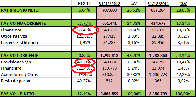 PASIVO El grupo ha sufrido un incremento importante en la partida de deuda financiera durante el ejercicio 2.012 por la razón que se ha expuesto en el apartado anterior, y que tiene como culpable principal las concesiones de Brasil y Mexico, y de la que se presume que estamos ante un pico de endeudamiento que comenzará a bajar a finales de 2.013 o inicio de 2.014. Vemos que la partida de provisiones se ha incrementado de manera notable y en su conjunto, podemos indicar que las fuentes de financiación se han incrementado de manera +/- correlativa al aumento del Activo, con una prevalencia importante de la financiación a largo plazo muy superior en términos brutos al incremento del endeudamiento a corto plazo ( +223 mill l/p vs +106 mill c/p), no obstante como consecuencia de un incremento mucho mayor en el activo no corriente respecto al exigible a l/p + fondos propios, se ha producido una disminución del Fondo de maniobra.