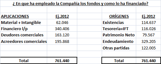 Durante el ejercicio 2.012 la compañía ha conseguido fondos a través de la financiación obtenida de las entidades financieras, la disposición de una parte de sus inversiones financieras temporales + su caja disponible y al ahorro por la por la menor inversión que ha efectuado en la adquisición de existencias. Los fondos obtenidos de estas partidas los ha empleado para: 1) realizar inversiones en inmovilizado, tales como instalaciones, 2) financiar la construcción de los trenes de la concesión de mexico y Brasil, así como proporcionar financiación a los clientes derivados del proceso de explotación) y a la cancelación de deuda comercial con sus acreedores correspondientes (ha disminuido en 13 días su periodo medio de pago).