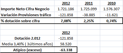 1) Atípicos por encima del Ebitda. Durante la revisión de las CCAA correspondiente al ejercicio 2.012, existe una partida que destaca de manera significativa por su enorme incremento, y no es otra que la partida de "otros gastos de explotación", sí observamos en la nota correspondiente de la memoria, observamos que la variación de provisiones por operaciones de tráfico incrementa respecto a 2.011 en un 213%¡¡¡¡¡. En mi opinión un atípico, es un hecho excepcional que no debemos esperar su recurrencia en ejercicios futuros, y para conocer sí realmente estamos ante uno de ellos observamos la dotación neta de los últimos 3 años ( 2009 no es representativa porque hubo reversión), y observamos cual ha sido el peso de la dotación de provisiones por operaciones de trafico comercial respecto a la cifra de negocio: