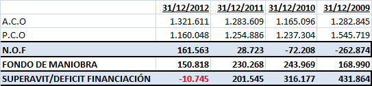 Necesidades Operativas de Fondos, Fondo de maniobra, Endeudamiento y Ratios de Liquidez.- Durante el ejercicio 2.012 CAF alcanza por primera vez un deficit de financiación como consecuencia de unas necesidades operativas de fondos mayores, y una disminución del fondo de maniobra necesario para financiarlas debido al notable incremento del activo no corriente como consecuencia del reconocimiento de los avances en la construcción y entrega de los trenes en régimen de alquiler principalmente de Mexico, además del retraso en el cobro de algún contrato de latinoamerica. Pese a este contratiempo puntual, parece claro que deberíamos ver una mejora relevante para finales del ejercicio.