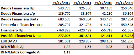 Como se ha indicado anteriormente, la mayor parte del endeudamiento del Grupo está asociado a las concesiones de Mexico y Brasil, y observamos que pese al incremento tan notable del endeudamiento que ha sufrido en el último año, se encuentra en unos niveles cómodos de aprox 1,52x del ratio DFN/ebitda al cierre del ejercicio 2.012, y que deberían ir disminuyendo principalmente a partir de finales de 2.013 y en los años siguientes. No osbtante, podemos observar que presenta una posición financiera negativa de casi 280 millones de euros, lo que nos da idea de la solvencia de esta compañía.