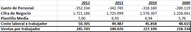 Según el cuadro anterior, se aprecia claramente como el coste por trabajador ha aumentado respecto a 2.011 y la cifra de ventas por empleado ha empeorado, como consecuencia de un leve incremento de la plantilla media durante el ejercicio 2.012 y una leve disminución de la cifra de negocio. El caso es que la empresa no pudo sacar adelante la reestructuración planteada y veremos en que acaba esto, sin olvidar que los trabajadores poseen una parte importante del capital de la empresa, que es algo positivo porque se presupone una mayor entrega ante un retorno directo en forma de dividendo, pero ante estos casos puede suponer un problema.