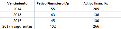Respecto a los vencimientos de deuda vs vencimientos de las partidas que componen su activo financiero a l/p ( relacionados por una estrecha vinculación), se observa que existe una magnífica y favorable correlación, presentando la mayor parte de vencimientos importantes de exigible a largo plazo después del ejercicio 2.017. Sí a esto sumanos, que adicionalmente a 31.12.2.012 las Sociedades del Grupo disponían de líneas de créditos y financiación hasta un límite de 354 millones de las que tan sólo habían dispuesto de 89 millones, denota que seguimos ante una compañía de importante solvencia tanto en el corto plazo como en el medio plazo.