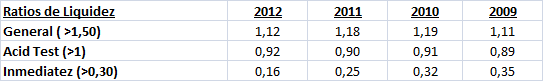 Respecto a las ratios de liquidez, en línea con lo comentado en anteriores apartados se ha producido un empeoramiento de dichas magnitudes, no obstante como se ha indicado anteriormente debería ser puntual, presentando el grupo líneas de financiación adicionales en caso de que le hicieran falta por un valor cercano a los 270 millones de euros junto a los casi 200 millones que posee en caja + IFTP al cierre del ejercicio 2.012