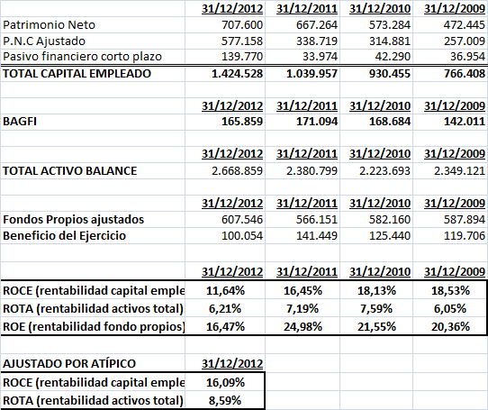 Rentabilidad.- Es obvio que sí facturas lo mismo, y has incrementado tu activo en un 10%, normalmente la rentabilidad sobre los activos va a disminuir salvo acciones excepcionales que impliquen una fuerte reducción de los costes. Pues es el caso de CAF en 2.012, sí para facturar lo mismo ha necesitado la inversión de 288 millones más en su activo, tendremos como se puede apreciar en el cuadro inferior un deterioro de los ratios de rentabilidad sobre activos. Sin embargo, sí ajustamos esos 63 millones de euros en variación de provisiones atípico, la rentabilidad sobre el capital empleado ( ROCE) sería prácticamente la misma , y la rentabilidad sobre el activo total mejoraría, lo que nos indica, que en realidad CAF hubiera mejorado márgenes.