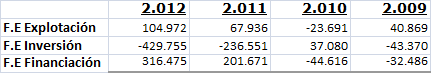 GENERACIÓN DE CAJA.- Una vez analizado el estado de flujos de efectivo, se puede apreciar la coherencia con lo indicado en anteriores apartados. Mientras la generación de efectivo de la actividad ordinaria experimenta una clara mejoría en 2012 repecto al resto de los años anteriores , la salida de caja como consecuencia de la inversión es brutal en 2.011 y principalmente en 2.012, esta situación se debe principalmente a las inversiones iniciales en las concesiones de Brasil y Mexico iniciadas a partir del ejercicio 2.011, donde ha tenido su máxima expresión en la última parte del año para poner en marcha todos los trenes de la concesión en Mexico. Como consecuencia de la necesidad de buscar financiación a esta inversión inicial, el grupo ha acudido a la deuda para financiar una parte muy relevante como ha sido nuevamente indicado en anteriores apartados, de ahí que mientras en 2.009 y 2.010 presentaba un flujo de efectivo negativo proveniente de la actividad de financiación, 2.011 y principalmente en 2.012 la emisión de deuda ha sido muy importante. A partir de 2.013 deberíamos tener un Free cash Flow positivo y alto y por ello la suma del F.E de explotación y F.E de inversión debería ser de un importe relevante como consecuencia de las menores inversiones y la alta generación de caja de las actividades ordinarias.