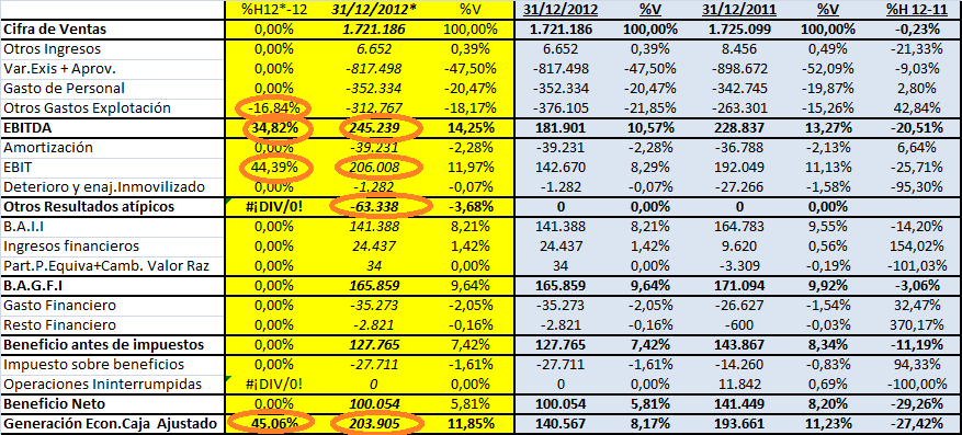 Sí nos fijamos en las columnas señaladas en amarillo, y reclasificamos los 63 millones de euros del exceso de variación de provisiones por operaciones de tráfico, se aprecia que los márgenes principales como Ebitda ajustado y Ebit ajustado mejoran no solo respecto al mismo ejercicio, sino también respecto al ejercicio 2.011, alcanzando el 14,25% en el caso del EBITDA y un 12% en el caso del EBIT, no obstante, sí hay un dato importante con el que me quedo es la generación de caja económica ajustada, donde durante el ejercicio 2.012 habría generado un cash flow económico superior a los 204 millones. Por tanto, podemos concluir que la cuenta de resultados está de alguna manera contaminada en sus márgenes principales por un atípico de cuantía relevante que de no haber tenido lugar ,hubiera provocado la mejora en los principales márgenes de la cuenta de explotación. Respecto al beneficio Neto disminuye en un 30% aprox, respecto a 2.011, entre otras circunstancias como se ha indicado anteriormente debido al notable incremento de la tasa fiscal y al registro de atípicos en forma de variación de provisión de insolvencias. Además como se ha visto en anteriores apartados destaca el incremento del coste de personal sin haber conseguido aumentar su cifra de negocio.