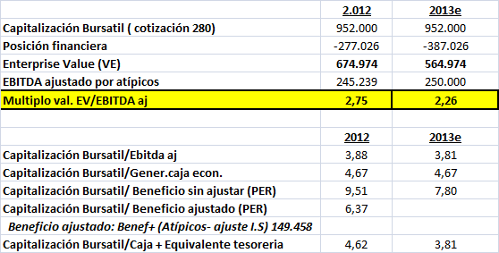 CONCLUSIÓN Y MULTIPLOS DE VALORACIÓN.-Bajo mi punto de vista, a pesar de presentar unos resultados del ejercicio 2.012 negativos, no han sido tan malos como lo ha interpretado el mercado. La dotación de provisiones por encima de los márgenes operativos principales ha provocado una cierta distorsión de estos , que de no haberse producido, hubieran sido mejores respecto al ejercicio 2.011. El incremento del endeudamiento en los últimos 2 años, estaba contemplado dentro de la inversión inicial fuerte que estaba prevista en las concesiones obtenidas en Brasil y Mexico, y que para finales de 2013 o prinicipios de 2.014 deberían ir disminuyendo conforme vaya recibiendo los flujos de caja derivados de estas concesiones ( Una parte de la concesión de Brasil se comenzó a recibir desde 2.011) y cancelando la deuda, por ello, es posible que estemos cerca de un techo de deuda, y veamos reducción interesantes a partir de Octubre/13 ( primer vencimiento de la financiación de Mexico). En mi opinión, CAF es interesante porque es una empresa que genera mucha caja, dentro de un sector con buenas perspectivas asociado al crecimiento mundial, con una diversificación geográfica importante, y una apuesta por los servicios en forma de alquileres y mantenimiento de trenes que tiene un mayor margen, prestando atención al avance de los fabricantes chinos y la presión en precios respecto a futuros concursos de los que creo CAF saldrá bien parado. Según se desprende del cuadro inferior, CAF está cotizando a unos precios muy atractivos, más si cabe sí ajustamos la partida de los 60 millones de euros que consideramos atípicos por un exceso en la dotación de provisiones de tráfico, actualmente CAF tendría un multiplo de valoración EV/EBITDA12 y 13e ajustado de 2,75x y 2,26x respectivamente, con un valor en bolsa de la compáñía de apenas 4 veces su ebitda estimado para 2013, o bien, poco más de 4 veces su generación de caja económica, con un per estimado respecto a 2.013 de 8.