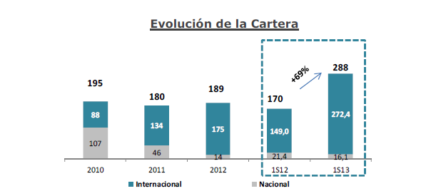 Al cierre de los primeros 6 meses del ejercicio 2013, la cartera de proyectos alcanzaba un importe de 288 millones de euros ( 272 mill de euros en proyectos internacionales), un 69% superior a la contratación que existía al cierre del primer semestre del ejercicio 2012. Esto supone un ratio de contratación/ cifra de ventas 2012 = 1,58, o lo que es lo mismo, una facturación equivalente de 1 año y 7 meses.