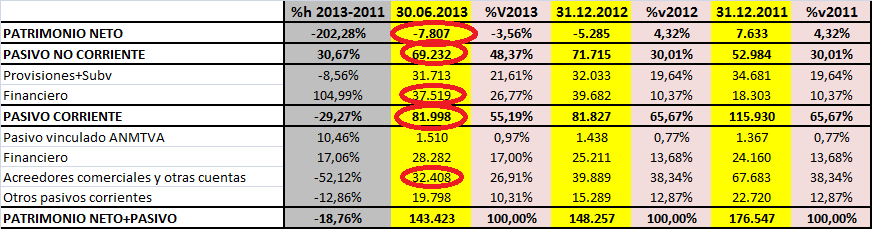 c) refinanciaciones, conversión de obligaciones, aplazamientos de pago con las administraciones públicas,etc que ha provocado una mejora en la estructura del pasivo desde el punto de vista de liquidez, ya que a fecha 31.12.2011 6,5 euros de cada 10 euros que debía la compañía vencía en los próximos 12 meses, mientras que a fecha 30.06.2013 este importe se reduce a 5,5 euros por cada 10 euros los que vencen a corto plazo, mejorando por tanto la liquidez y proporcionando cierto oxígeno adicional a la situación que se tenía. La contraprestación que no es poca, una mayor carga financiera por el mismo principal.