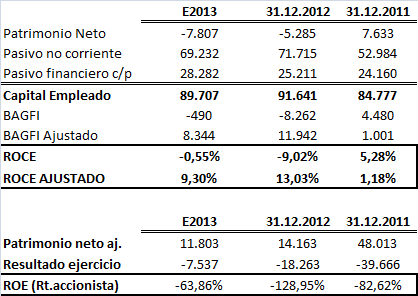 Rentabilidad. Desde el punto de vista de la rentabilidad sobre el capital empleado y del accionista, a fecha actual está claro que estamos ante una compañía que no es nada atractiva para invertir, si observamos el ROCE durante 2013 y 2012, vemos que el resultado es negativo, lo que indica que la compañía no es capaz de generar ninguna rentabilidad a los fondos aportados por los accionistas y acreedores financieros, que adicionalmente suponen un coste ( financiero en caso de recursos aportados por acreedores y de oportunidad en caso de recursos aportados por los accionistas), lo que a priori nos indicaría que no se debe destinar fondos a esta compañía ya que no es capáz de generar valor positivo y mucho menos una rentabilidad superior al coste de esos fondos tomados. No obstante, en este punto me gustaría subrayar otra vez el enorme coste de oportunidad de la inversión en vertice , si cálculamos el Roce ajustado, principalmente excluyendo la minusvalía de la valoración de vertice observamos que la compañía es capaz de generar rentabilidad positiva, de tal forma, que por cada 100 euros de fondos que ha tomado la compañía y que devenga coste financiero, o bien coste de oportunidad en el caso de los accionistas, es capáz de obtener 9,30 euros , lo cual significa que el resultado es positivo, pero inferior al coste promedio exigido por los accionistas y acreedores financieros. Desde el punto de vista de la rentabilidad del accionista (ROE), es una compañía que destruye mucho valor, por este motivo, si hubieramos invertido nuestro capital en esta compañía durante los ejercicios anteriores, se hubiera evaporado . Veremos sí es cápaz de revertir esta situación en ejercicios futuros.