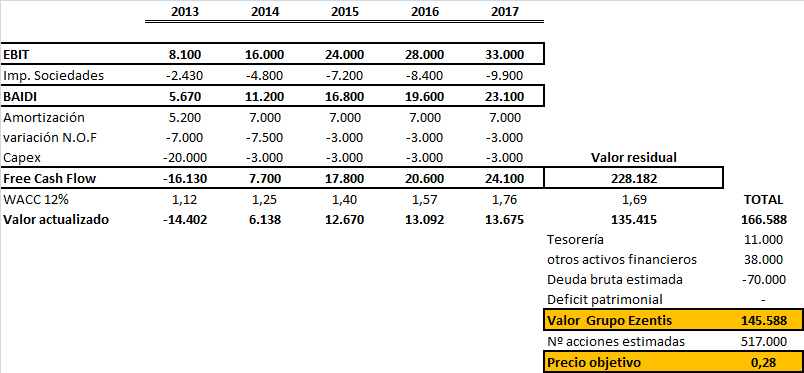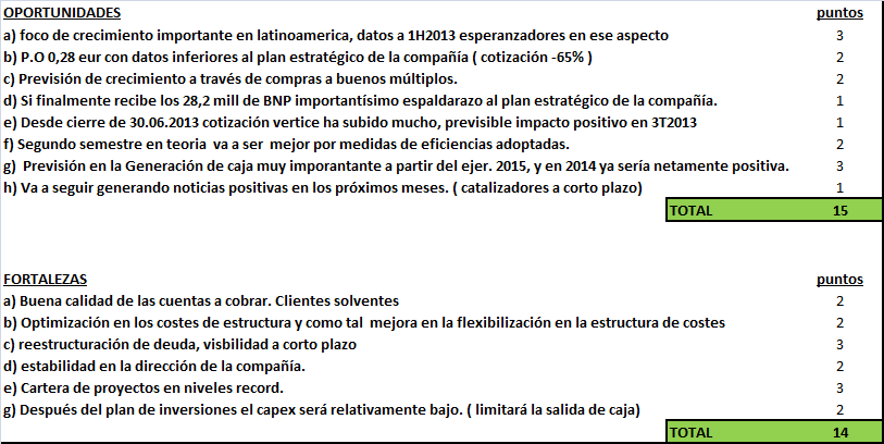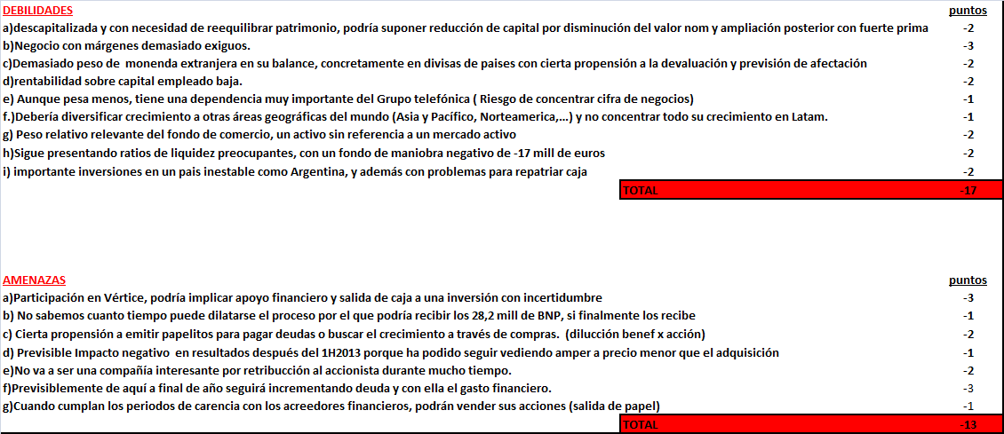 El precio objetivo cálculado por el método de descuento de flujo de caja libre a un horizonte temporal de 5 años + valor residual, con tasa de riesgo 12% ( coste promedio capital) sale 0,28 euros por acción, con datos inferiores al plan estratégico de la compañía. Sí actualmente Ezentis cotiza algo por encima de 0,17 euros, tendría un potencial de revalorización de un 65%. Lo cierto es que los riesgos enumerados en anteriores apartados pesan demasiado, y desde luego hace tiempo que no me ocurría tener sentimientos tan contradictorios sobre la toma de posiciones en una compañía , ya que por otro lado existen brotes verdes muy significativos ( cartera de proyectos en niveles record, crecimiento esperado a través de compras, mejora operativa en el área internacional muy positivo durante el 1h2013, visbilidad a corto plazo por reestructuraciones,... que invitan a pensar que a la cotización actual Ezentis podría ser una opción interesante a medio plazo, por tanto, voy a realizar un analisis DAFO un tanto particular y más detallado con puntuación para intentar decantarme: