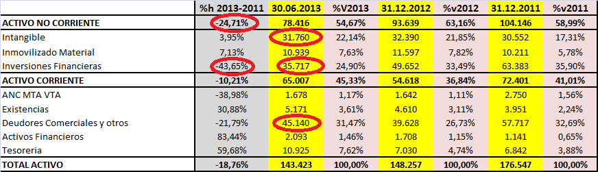 Aunque más del 50% de la inversión realizada a 30.06.2013 se efectúa en activo estructural, estamos ante una compañía de servicios y no industrial o con procesos de transformación importantes, entre otras porque apenas existe peso del inmovilizado material en el activo, y adicionalmente una parte relevante de esta inversión a largo plazo obedece al intangible, siendo en su mayor parte un fondo de comercio de consolidación asignado al grupo calatel por importe de 27,4 millones de euros. Este tipo de activo, como ya ha sido manifestado en anteriores informes no es identificable y conlleva el peligro de la inexistencia de un mercado activo a tomar como referencia que nos indique sí ese valor es fiable o no, salvo que decidamos acogernos a la estimación de valoración que realiza la compañía por descuento de flujos de caja y verificado por la firma de auditoria. Destaca la enorme caida del peso de las inversiones financieras como consecuencia del deterioro de la participación en Vertice, situación muy negativa, porque supone un minusvalía en un activo cuasi líquido. Sin embargo, por el lado positivo, destacaría la partida de deudores comerciales, con un peso del 31% en el activo de balance, y que se le presupone de cierta calidad porque son saldos con clientes financieramente muy solventes.