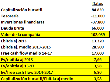 Antes de comenzar, me gustaría indicar que los datos presentados sobre el endeudamiento neto, distan de los datos que la compañía ha publicado, ya que existen divergencias de selección de partidas. Yo he considerado como Equivalentes a tesorería, la participación de vertice, la de amper y el credito financiero contra BNP ( en función del grado de pridencia podría excluirse). ( No se ha actualizado el valor de vertice a la cotización actual)