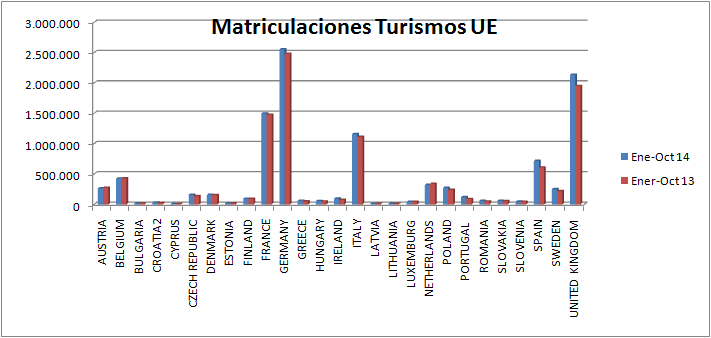 2014 supone un importante cambio de tendencia, ya que al cierre de Octubre los 5 principales mercados del automóvil de la UE crecen respecto al 2013. Si cogemos los datos globales de la Unión Europea observamos que en los 10 primeros meses se matriculan 10.645.907 turismos, un 6,1% más que los matriculados en el mismo periodo de 2013 donde ascendieron a 10.030.753, destacando el incremento de cerca de un 20% en España.