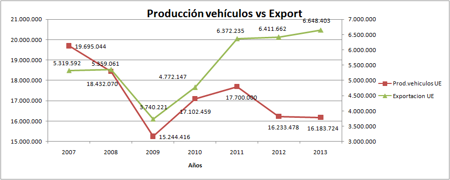 El gráfico anterior nos da una idea de la importancia de las exportaciones y la imperiosa necesidad de que los fabricantes europeos sean competitivos, si nos fijamos en la producción de vehículos, en el año 2007 se fabricaron 19,7 mill de vehículos, mientras que en 2013 se produjeron 16,2 mill, es decir, un 18% menos¡¡ Sin embargo con las exportaciones ocurre todo lo contrario, y es lógico, porque los productores buscaron la alternativa del mercado externo ante la depresión del mercado europeo, lo que supuso que se pasará de una exportación de 5,3 mill de vehículos del año 2007 a 6,65 mill en el año 2013, o lo que es lo mismo, un incremento de un 25%¡¡¡ para hacernos una idea más clara de la importancia de la depreciación del euro: por cada 100 vehículos fabricados en 2007, 27 se exportaban. En el año 2013, por cada 100 vehículos fabricados , 41 se exportan.