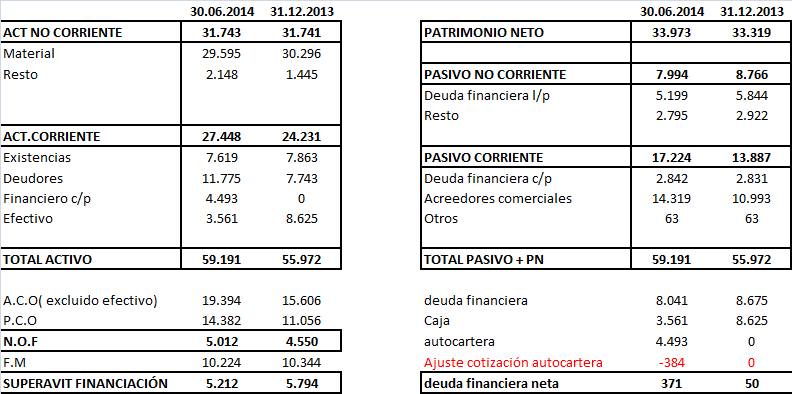 Y que vemos, que la estructura financiera sigue siendo más que sólida, vemos que tiene un superávit de financiación relevante y un endeudamiento bajo ( 13,5% sobre el total del activo) donde incluso al cierre de 2014 llegará a alcanzar una deuda financiera claramente negativa, por lo que se puede concluir que la empresa está preparada para acometer inversiones relevantes si fuera necesario. Los ratios de liquidez muestran buenos niveles, un poco por debajo a 30.06.2014, y el working capital aumenta unos 0,5 mill, algo que puede resultar lógico sí tenemos en cuenta que la cifra de negocio ha crecido y es posible que determinados clientes les aprieten en condiciones. Y como siempre destacar la calidad del activo, donde no tenemos un Fondo de comercio que nos haga dudar de su valoración al no tener un mercado de referencia, donde la mayor parte de su inmovilizado material son planta e instalaciones y maquinaria puntera a la vanguardia de la tecnología, donde la mayor parte de su activo circulante lo constituye partidas liquidas o relativamente liquidas,donde la valoración de las inversiones inmobiliarias está claramente por debajo de su valor de mercado en base a la tasación dada por LGT en su memoria anual, y donde el coeficiente de autofinanciación es positivo con más del 50% del activo financiado con fondos propios.