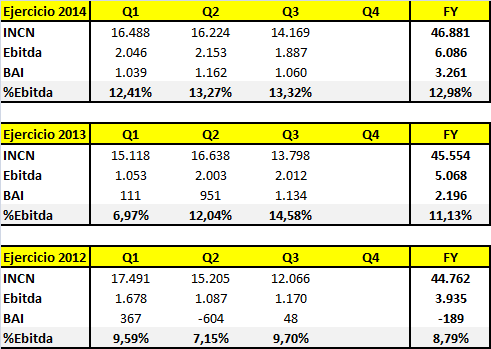 Vemos claramente, que las acciones emprendidas por la compañía han sido fantásticas y han tenido su premio en la rentabilidad del negocio (1er Trimestre y 2Trimestre de 2014 los mejores en rentabilidad operativa de los 3 últimos años. La mejora de la productividad basada en la eficiencia, acompañada de todas las acciones en diversas áreas con objeto de rebajar costes han tenido su fruto y vemos que margen el bruto de explotación ajustado a caja es el más alto en los 3 últimos ejercicios con un 12,98% al cierre del tercer trimestre, además como es lógico ha contribuido también el leve incremento en la cifra de ventas. Mención especial merece el 3Trim estanco de 2014, vemos que el margen asciende a 13,32% respecto al 14,58% del año 2013. No puedo saber el motivo, pero viendo la cifra de empleados declarada por la compañía, me hace pensar que estén asumiendo más carga laboral por una previsión de incremento de pedidos en los próximos meses y por el traslado de algunos empleados a la planta de la india, y la necesidad de formar a sus nuevos sustitutos, lo que supone que pueda existir algún tipo de solapación por este motivo. Adicionalmente pueden existir algunos gastos por la joint venture constituida en la india que no se hayan activado como coste incremental de la inversión financiera y que podrían ser excepcionales a este periodo, estaríamos hablando de viajes, hoteles, asesoramiento de abogados, consultores,… No obstante tendremos que estudiarlo en la memoria.