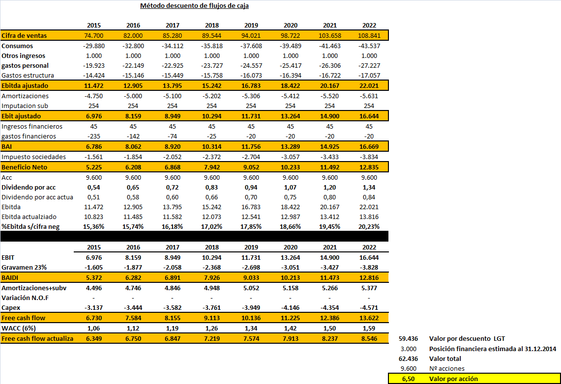 8)Gastos de estructura, considero un cierto incremento por prudencia ante la incertidumbre en el coste energético por un posible encarecimiento de la electricidad principalmente en 2015 y 2016, así como un incremento en otros gastos de explotación. El resto de años incrementos constantes de un 2%. ( No obstante han tomado medidas como sistemas inteligentes de alumbrado para ahorrar y mejoras en el proceso de fundición)