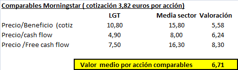 Si hacemos un cálculo rápido, observamos que LGT está cotizando a unos múltiplos muy interesantes, con un precio de cotización que se sitúa en un EV/EBITDA de 4,21X para el cierre de 2014. A precios actuales está cotizando a 7,1 veces sus beneficios estimados para el ejercicio 2015 y 5,4 veces su flujo libre de caja.