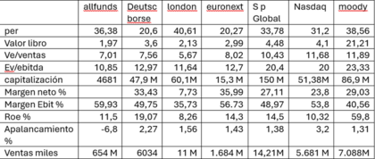 Los operadores en el mercado son muchos, añado notas de algunos con comparaciones y datos financieros, son cinco operadores del mercado. ALLFUNDS, la empresa opada y una agencia de calificación. No ha habido ninguna selección especial, tres operadores europeos y dos americanos. el mercado es enorme y simplemente es compartir que ratios tienen para identificarlos en un contexto. En común tienen que son valores alcistas en el largo plazo y actualmente han sufrido un recorte, en principio de corto plazo, el tiempo lo dirá.