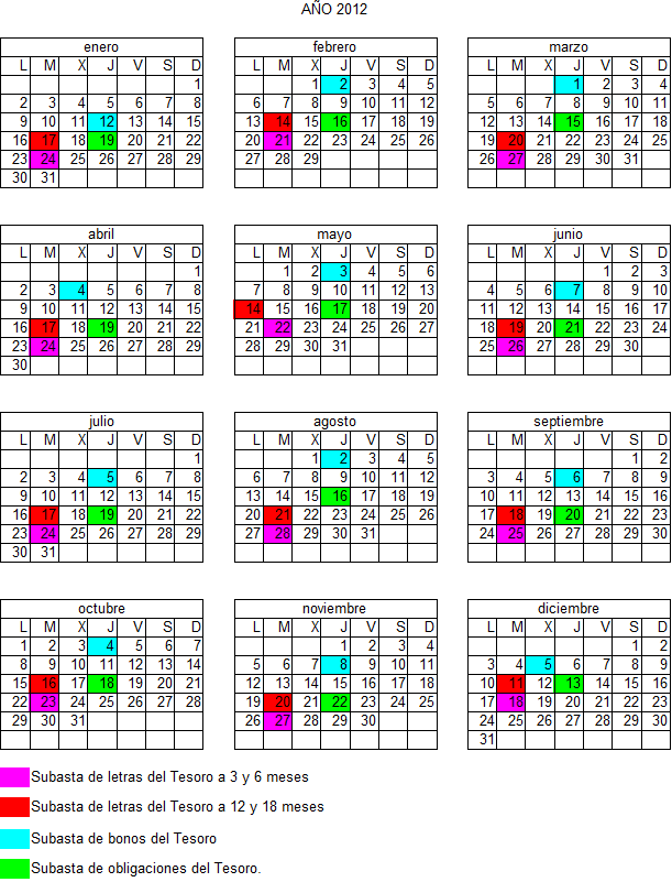 Como todos los años el Tesoro Público ha presentado el calendario con las fechas de las subastas de la deuda del estado, y también este año es extraordinario y presenta el doble de días de lo que era normal hasta el año 2010. En lugar de las 24 subastas al año, 12 de letras y otras 12 de bonos u obligaciones, vamos a tener 48 subastas. Salvo alguna excepción las subastas de letras coinciden en martes y las de bonos u obligaciones en jueves.