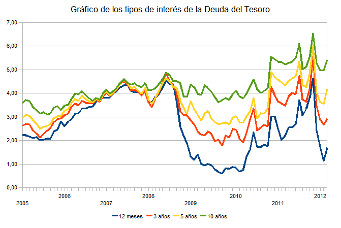 La siguiente gráfica muestra la evolución de la cotización en cierre mensual de los tipos de interés de la Deuda del Tesoro en el Mercado Secundario actualizada al 31 de marzo de 2012. Como pueden ver está clara la intervención del Banco Central Europeo, que en parte las entidades financieras han destinado al carry trade. el BCE les presta dinero al 1 % y con este dinero compran deuda española al 4 % ganando un 3 % sin ningún esfuerzo. Mientras tanto los pequeños inversores somos desplazados ya que las rentabilidades que han alcanzando las letras del Tesoro pierden todo el interés para nosotros, pero poco a poco parece que se va a volver al grado de exigencia normal de acuerdo al riesgo de loa inversión y seguramente antes del verano volveremos a ver la rentabilidad de las letras a 12 meses por encima del 3 %.