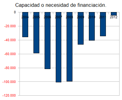 En el anterior post comentábamos que la capacidad o necesidad de financiación se obtiene como la suma de los saldos por cuenta corriente y cuenta de capital. Un saldo positivo indica capacidad de financiación (préstamo neto al exterior), mientras que un saldo negativo significa necesidad de financiación (endeudamiento neto con el exterior). En la siguiente gráfica, según los datos obtenidos del Banco de España, podemos ver como en España en el rango estudiado, del año 2004 hasta el 2012, el saldo es siempre negativo, por lo que hay necesidad de financiación, se invierte más de lo que se ahorra, y ese déficit sólo es posible si hay inversores extranjeros dispuestos a financiarlo, porque tienen confianza en recuperar su inversión.