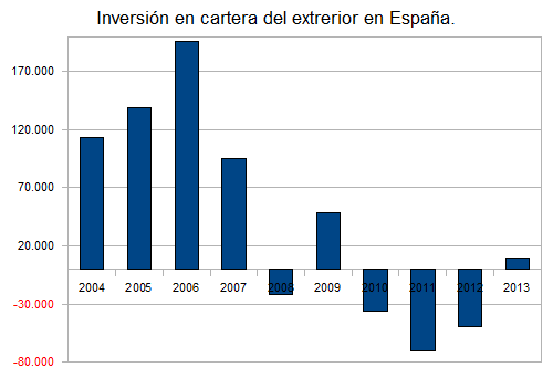 En el gráfico siguiente se puede ver cómo a partir de 2008 se comienza a perder la confianza en España y las inversiones en cartera desde el extranjero comienzan a disminuir e incluso hay retirada de dinero, así era imposible que la Bolsa subiera, e incluso que se mantuviera donde estaba. Cómo se aprecia en el gráfico, en 2013, esta tendencia se ha invertido y hay inversión positiva tanto en Bolsa como en Deuda y por eso, la Bolsa se recupera y baja la prima de riesgo.