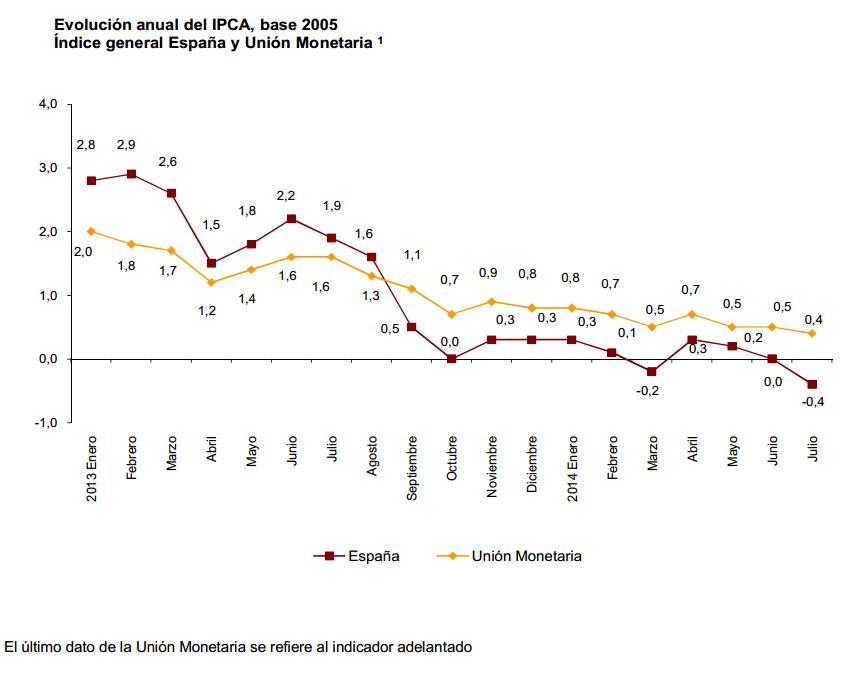 Hoy ha publicado el Instituto Nacional de Estadística (INE) la tasa de variación anual y mensual del IPC de España correspondiente al mes de julio. Con respecto al mismo mes del año pasado, la variación es del -0,3% y con respecto al mes de junio del -0,9%, lo que lentamente pero de forma inexorable, demuestra la solución a los excesos cometidos en España de forma reiterada y continuada (fuertes incrementos del gasto público a base de deuda, inversiones empresariales excesivamente arriesgadas y el consecuente incremento desaforado del consumo de las familias) solo tienen una solución: La deflación.