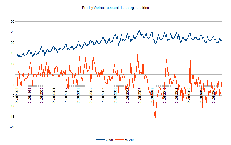 En la siguiente gráfica se muestra, en trazo azul, la generación de energía eléctrica mensual en Gwh, y en trazo rojo la variación en % entre un mes y el mismo mes del año anterior. Como pueden ver llevamos muchos meses en los que la línea roja está más veces por debajo del eje horizontal, lo que quiere decir que se ha generado menos energía que el mismo mes del año anterior, y si la tendencia continua igual no tardaremos muchos meses en ver a la linea azul por debajo de los 20 Gwh., lo que querrá decir que volvemos a niveles de consumo de antes de 2005.