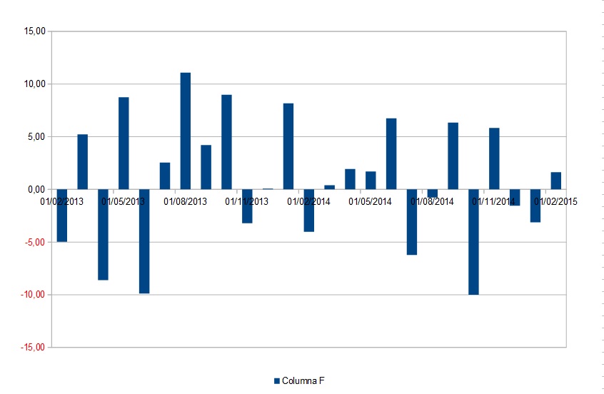 El mes pasado se cerró en los 10.027 puntos y por ahora estamos en positivo, pero hay mucho miedo pese a que la mayoría de analistas opinan que continuamos dentro de una tendencia lateral alcista. En la siguiente gráfica, pueden ver la evolución de la variación en % entre dos vencimientos consecutivos, en la que hemos supuesto que el vencimiento de febrero termine en los 10.190 puntos, que es como cotiza actualmente. Desde enero de 2013 nunca se han producido tres vencimientos seguidos bajistas, pero nada impide que el de febrero rompa la pauta.