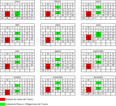 Tradicionalmente el Tesoro Público publica un calendario para el año en curso con las fechas en las que tiene previsto realizar las subastas de la deuda pública con que financiar las necesidades del Estado.