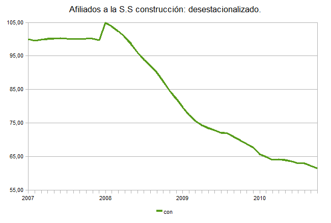 Como esta gráfica es el total de todos los sectores anteriores está claro que su evolución depende de lo que hagan aquellos. Aunque la pendiente se ha suavizado desde mediados de 2009, y pese al repunte de Agosto, en Septiembre y Octubre se ha perdido lo recuperado. Pese a todo si continúa suavizándose la pendiente de la caída pronto se podrá decir que se ha tocado fondo en la destrucción de empleo, lo que no necesariamente quiere decir que se comience a crear. Se ve bastante claro que hasta ahora la crisis en España viene como consecuencia de la burbuja inmobiliaria, que lógicamente ha afectado y arrastrado también a otros sectores debido al alto porcentaje que representa en el PIB.
