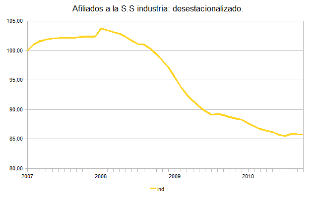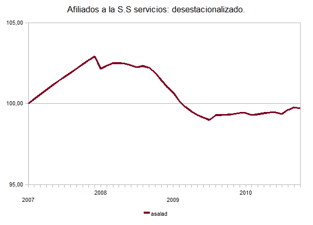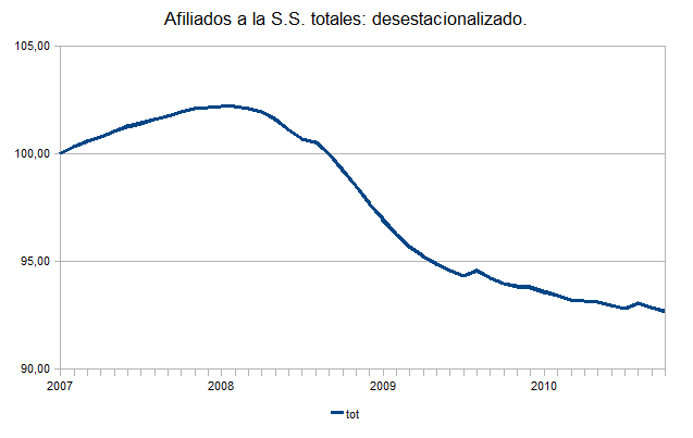 Las siguientes gráficas muestran la evolución del número de afiliados a la Seguridad Social desde Enero de 2007 hasta el mes de Octubre de este año. Son datos desestacionalizados y están representados tomando como base 100 el dato de enero de 2007, así se puede ver más fácilmente la variación en porcentaje.