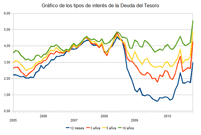 La siguiente gráfica muestra la evolución de la cotización en cierre mensual de los tipos de interés de la Deuda del Tesoro en el Mercado Secundario actualizada al 30 de Noviembre de 2010. Es espectacular la subida, efecto de la presión de los mercados internacionales producida en el último mes, aunque afortunadamente para el Tesoro Público la situación se está relajando, por ahora, y seguramente el mes que viene las rentabilidades exigidas serán más bajas. De hecho ya lo están siendo los primeros días de mes.
