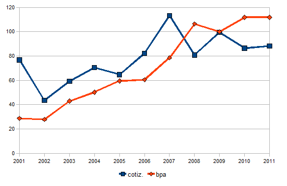 A continuación se presenta el gráfico de la evolución de la cotización de cierre de cada año comparada con el bpa corregido de resultados extraordinarios del mismo año, tomando como base 100 el año que más cerca está del PER 13,30 veces.