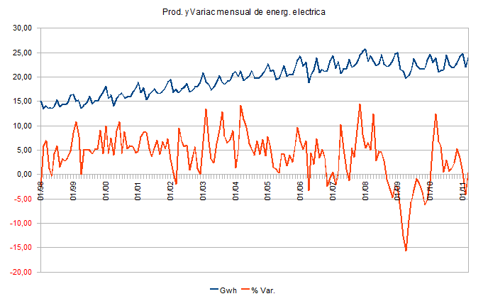 En Febrero del año pasado comenzó una tendencia creciente en la generación de energía eléctrica después de 18 meses en que cada mes se había consumido menos energía que el mismo mes del año anterior que se ha mantenido hasta el mes de Febrero pasado, tal y como se puede ver con la línea roja del gráfico que se adjunta. La línea azul muestra los Gwh generados en cada mes y la linea roja la variación en porcentaje con respecto al mismo mes del año anterior. En Febrero de 2011 se la generado un 4,19 % menos de energía que en Febrero de 2010 y Marzo se ha salvado con un 0,39 % más que el mismo mes de 2010.