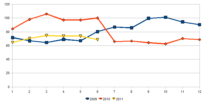 Por ahora la linea amarilla, que refleja las matriculaciones de 2011, está por encima de la azul, lo que nos indica que estamos un poco mejor que en 2009, pero como se ponga por debajo de la linea roja será muy mala señal ya que querrá decir que volvemos a estancarnos.